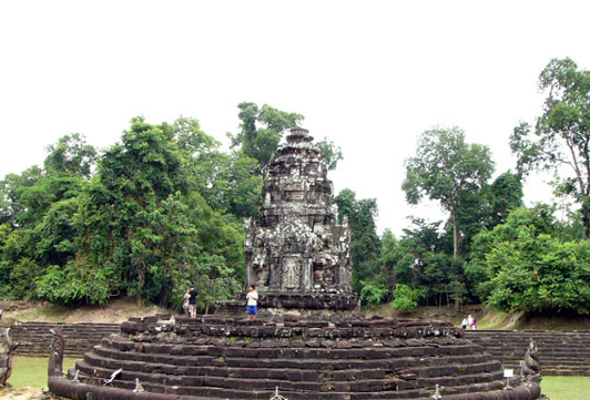 • นาคพันรอบฐานปราสาท กลางสระน้ำเป็นที่ตั้งของฐานปราสาทที่มีลักษณะกลมเป็นชั้นๆ ที่ฐานหรือชั้นล่างสุดของฐานปราสาทนี้ เป็นนาคเจ็ดเศียรสองตัวที่หางเกี่ยวพันกันทางทิศตะวันตก ลำตัวโอบล้อมฐานหันหน้ามาทางทิศตะวันอออก นาคสองตัวนี้เชื่อกันว่าเป็นพญานาคที่ชื่อว่านันทะและอุปานันทะ