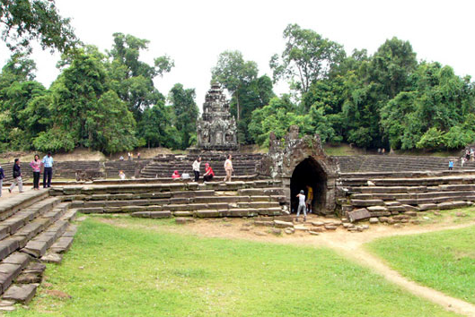 • ภาพสลักที่ปรางค์ประธาน ตรงกลางของสระมีบันไดขึ้นไป 7 ชั้น สู่ปรางค์ประธานซึ่งอยู่ตรงกลาง ทางเข้าอยู่ทิศตะวันออก ส่วนอีก 3 แห่งรอบปราสาทเป็นประตูหลอก ที่มุมของปรางค์ประธานมีรูปพญาครุฑ ด้านหลังของปรางค์ประธานมีภาพสลักคติธรรมทางพุทธศาสนา แต่ภาพเหล่านี้ได้ถูกดัดแปลงให้เป็นความเชื่อตามศาสนาฮินดู เช่น ภาพสลักเมื่อเจ้าชายสิทธัตถะออกผนวช ภาพนี้ถูกดัดแปลงให้มีรูปลักษณะคล้ายศิวลึงค์ อีกภาพหนึ่งเป็นภาพสลักเมื่อพระพุทธเจ้านั่งสมาธิอยู่ใต้ต้นโพธิ์ก็ถูกดัดแปลงเช่นกัน
