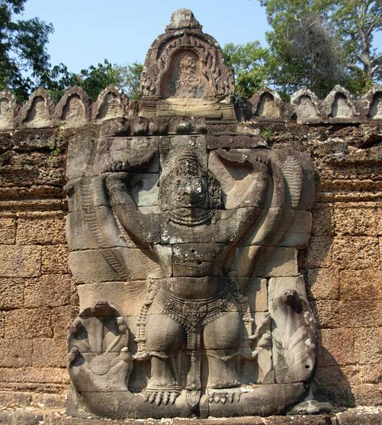 • รูปสลักนูนสูงครุฑที่กำแพง กำแพงทางเข้าปราสาทมีประติมากรรมที่สวยงาม ได้แก่รูปสลักนูนสูงเป็นรูปครุฑขนาดสูงเท่าตัวกำแพงศิลาแลงหรือประมาณ 3 เมตร ครุฑใช้มือทั้งสองจับหางนาค ส่วนขาของครุฑทั้งสองข้าง ก็จับลำตัวของนาค ประติมากรรมนี้จะพบเห็นได้ที่ด้านข้างโคปุระที่กำแพงปราสาททั้งสี่ทิศ