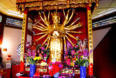เมื่อจุดเทียนเผาธูปไหว้พระขอพรแล้ว เดินตรงข้ามสะพานไปจะเป็นศาลาแปดเหลี่ยมซึ่งตั้งอยู่กลางสระน้ำมรกต ศาลาแปดเหลี่ยมหลังนี้เป็นศาลาที่อู๋ซานกุ้ยสร้างในสมัยราชวงศ์ชิง ในศาลาประดิษฐาน เจ้าแม่กวนอิมพันกร และเจ้าแม่กวนอิมพม่า หรือเรียกว่า เจ้าแม่กวนอิมหยก นั่นเองตรงจากศาลาไปจะมีวิหารใหญ่ที่มีสามประตู เนื่องจากคนจีนถือว่าพระพุทธเจ้ามี 3 แบบทั้งในอดีต ปัจจุบัน และอนาคต ด้านหลังสุดของวัด ซึ่งเป็นที่ตั้งของโบสถ์ไทย ภายในโบสถ์ไทยแห่งนี้เป็นที่ประดิษฐาน พระพุทธชินราช”ของไทย ซึ่งจำลองมาจากพระพุทธชินราช จังหวัดพิษณุโลก โดย นายกรัฐมนตรีเกรียงศักดิ์ ชมะนันท์ ได้อัญเชิญมาประดิษฐานไว้ ณ วัดแห่งนี้ เพื่อเชื่อมสัมพันธไมตรีระหว่างไทย-จีน นับเป็นพระพุทธรูปองค์แรกในประเทศไทยที่มาตั้งอยู่ในเมืองจีน