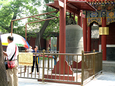 หอนาฬิกา ส่วนด้านซ้ายเป็นหอระฆัง จะมีนักท่องเที่ยวทั้งชาวจีนและชาวต่างชาติชอบมาตีระฆัง เสียงระฆีงดังกังวานไม่ขาดสาย ชาวจีนเชื่อกันว่า ตีระฆังเพื่อก่อให้เกิดความหวัง ความปรารถนาของตนจะประสบผลสำเร็จ โดยทั้วไปจะตีกันคนละ3 ครั้ง ผ่านกระถางธูปเข้าไปในวิหารแรกของวัดลามะ คือ วิหารจตุโลกบาล ข้าง ในวิหารเป็นที่ประดิษฐานของพระอะมีถัวโฝง หรือ พระอมิตาพุทธ หากใครที่ชื่นชอบนิยายจีนกำลังภายใจ คงจะจดจำคำพูดที่หลวงจีนชอบพูดกันจนติดปากว่า อมิตาพุทธ ในความเชื่อของชาวจีน ก่อนตายหากท่องคำว่า อมิตาพุทธ อย่างสม่ำเสมอก็จะได้ไปสวรรค์ ด้านหลังวิหารจตุโลกบาลจะเป็นที่ประดิษฐานของ พระเหว่ยโถว หรือ พระที่ทำหน้าที่คุ้มครองวัด พระเหว่ยโถว ปางยืน ลักษณะคล้ายทหารองค์รักษ์มากกว่านักบวช ในแต่ละวัดของจีนจะมีอยู่เพียงองค์เดียว และจะยืนหันหน้าไปทางทิศเหนือเท่านั้น