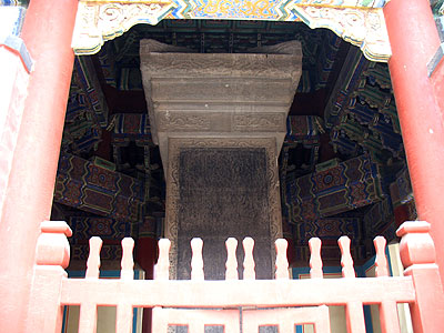 เมื่อผ่านวิหารจตุโลกบาลออกมาจะเป็นที่ตั้งของ ศิลาจารึกขนาดใหญ่ 4 ด้าน 4 ภาษา แต่ละด้านแกะสลักตัวอักษรภาษาจีน ภาษาแมนจู ภาษามองโกล และภาษาทิเบต เนื้อหาของตัวอักษรเหล่านี้มาจากหนังสือ หล่ามาซัว หรือ ทฤษฏีลามะ ซึ่งฮ่องเต้สมัยราชวงศ์ชิงทรงนิพนธ์ขึ้น กล่าวถึงความเป็นมาของพุทธศาสนานิกายทิเบต และนโยบายของรัฐบาลชิงที่มีต่อนิกายลามะ และเป็นการแสดงให้เห็นถึงความสามัคคีของชนชาติต่างๆในจีน ด้านข้างของศิลาจารึก มีจ้วงจิงถ่งตั้งอยู่ ลักษณะคล้ายถังทองเหลืองทรงกลม ชาวจีนและชาวชนชาติส่วนน้อยในจีนที่นับถือพุทธศาสนานิกายทิเบตจะนิยมเข้าไป หมุนจ้วงจิงถ่ง พวกเขาเชื่อว่า หมุนจ้วงจิงถ่ง 1 รอบเท่ากับได้สวดมนต์ 1 จบ หมุนไปเรื่อยๆ ตั้งจิตอธิษฐานให้ดีๆก็จะสำริดผลได้