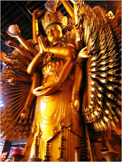 ภายในวัดมีวิหารเจ็ดหลังตั้งอยู่บนพื้นที่กว้างขวางที่สุดในบรรดาวัดของนครเซี่ยงไฮ้ วิหารแต่ละหลังมีรูปปั้นพระพุทธรูปและเทพผู้พิทักษ์ประดิษฐานอยู่ให้ผู้คน ได้เข้ามากราบไหว้ขอพรอาทิ ในวิหารใหญ่มีพระศรีศากยมุณี วิหารพระเมตไตรย หรือ วิหารเจ้าแม่กวนอิมที่มีองค์เจ้าแม่กวนอิมพันกรรายล้อมด้วยพระพุทธรูปสีทอง 500 องค์