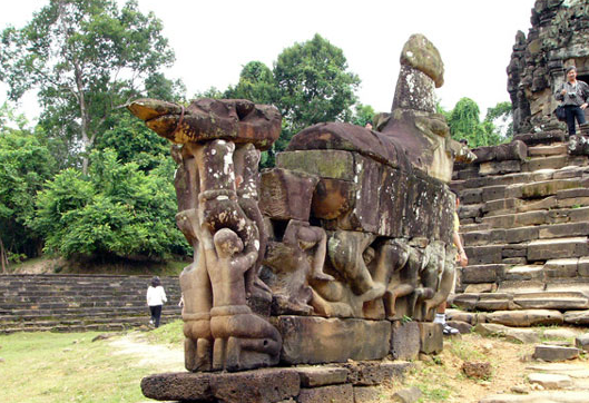 • รูปสลักคน ราชสีห์ ม้า ช้าง รูปสลักในศาลาทางด้านทิศตะวันออกมีลักษณะเป็นใบหน้าของมนุษย์ ส่วนทางด้านทิศใต้เป็นรูปใบหน้าราชสีห์ รูปของม้าอยู่ทางด้านทิศตะวันตก และรูปของช้างอยู่ทางทิศเหนือ สันนิษฐานว่ารูปสลักใบหน้ามนุษย์เดิมทีเป็นหน้าของวัว เพื่อให้สอดคล้องกับคติธรรมทางศาสนาฮินดูเช่นเดียวกับภาพสลักพระพุทธเจ้าที่ถูกสกัดใบหน้า ลำตัว แขน ออกให้เหลือฐานกับลำตัวมองดูคล้ายศิวลึงค์ในสมัยพระเจ้าชัยวรมันที่ 8