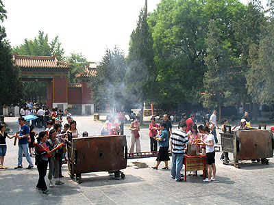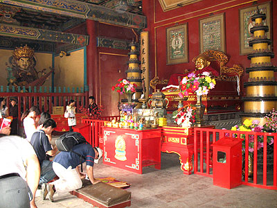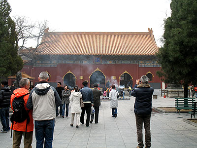 “วัดลามะเป็นวัดสำคัญของปักกิ่งและของจีน ชาวพุทธในจีนจะต้องมาเยือนที่นี่สักครั้งหนึ่งในชีวิต เพื่อมาสักการะสิ่งศักสิทธิ์ในวิหารต่างๆภายในยงเหอกง” เจ้าชวน หนุ่มชาวปักกิ่ง อาชีพนักวิจัยตลาด บอกกับผู้เขียนขณะเข้ามาไหว้พระในวัดลามะกับเพื่อนหญิงของเขา บริเวณด้านนอกของวัดลามะจะคราคร่ำไปด้วยร้านค้าต่างๆมากมาย มีทั้งรายอาหาร ร้านขายของที่ระลึก ร้านทำผม ฯลฯ แต่ร้านค้าที่มีมากที่สุดเห็นจะเป็นร้านขายเครื่องสังฆภัณฑ์ ผู้เขียนได้แวะเวียนเข้าไปพูดคุยกับร้านขายเครื่องสังฆภัณฑ์ร้านหนึ่งใกล้ๆ ประตูทางเข้าวัดลามะ เจ้าของร้านเป็นหญิงชาวจีน ท่าทางใจดี ชื่อ หวังผู่หวา บอกกับผู้เขียนว่า