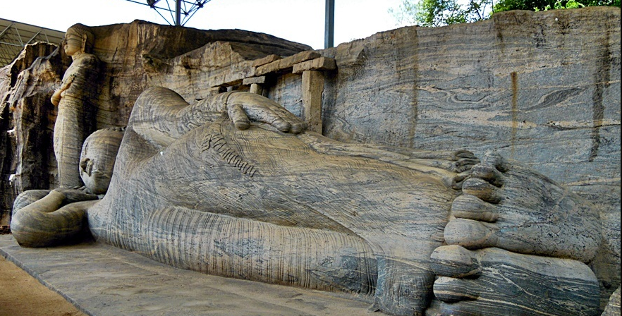 เป็นรูปสลักหินแกรนิตขนาดใหญ่ เป็นพระพุทธรูปยืน พระพุทธรูปนั่งปางสมาธิและพระพุทธรูปปางปรินิพพาน สลักจากภูเขาหินชิ้นเดียวพระพุทธรูปปางนิพพาน มีความยาว 15 เมตร ซึ่งมีพุทธลักษณะที่งดงาม บ่งบอกความสุขสงบของนิพพาน ขณะที่ พระพุทธรูปยืน หัตถ์ 2 ข้างกอดพระอุรา มีความงดงามตามแบบพุทธสิลป์แบบอมราวดี จีวรจีบเป็นริ้วคู่ป็นรายละเอียด รู้จักกันในนามปางอนิมิส โลชนะซึ่งหายากมาก พระพุทธรูปนี้อยู่หน้าต้นโพธิ์ทรงประทับขณะทรงตรัสรู้ เป็นการแสดงความคารวะที่ให้ร่มไม้ขณะทรงบำเพ็ญเพียร ใกล้กันนั้นมีการแกะสลักหินเป็นถ้ำเล็ก เรียกว่า ถ้ำวิทยหาร มีทางเขาที่แกะสลักเป็นนาคและสิ่งศักสิทธิ์ของฮินดู ข้างในมีพระพุทธรูปอีกองค์หนึ่งเป็นทรงสมาธิ